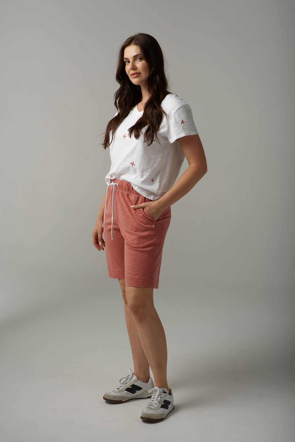 Fresh and stylish, our V-neck cotton tee is crafted from soft, breathable cotton for all-day comfort. In a crisp white base, it features a subtle all-over small terracotta cross print that adds a touch of modern pattern to a classic silhouette. Short sleeves and a relaxed fit make it perfect for layering or wearing on its own for effortless everyday style.