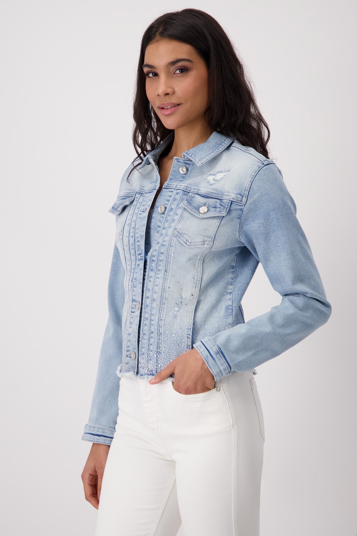 This denim jacket made of high-quality cotton impresses with unique rhinestones arranged in a special gradient.