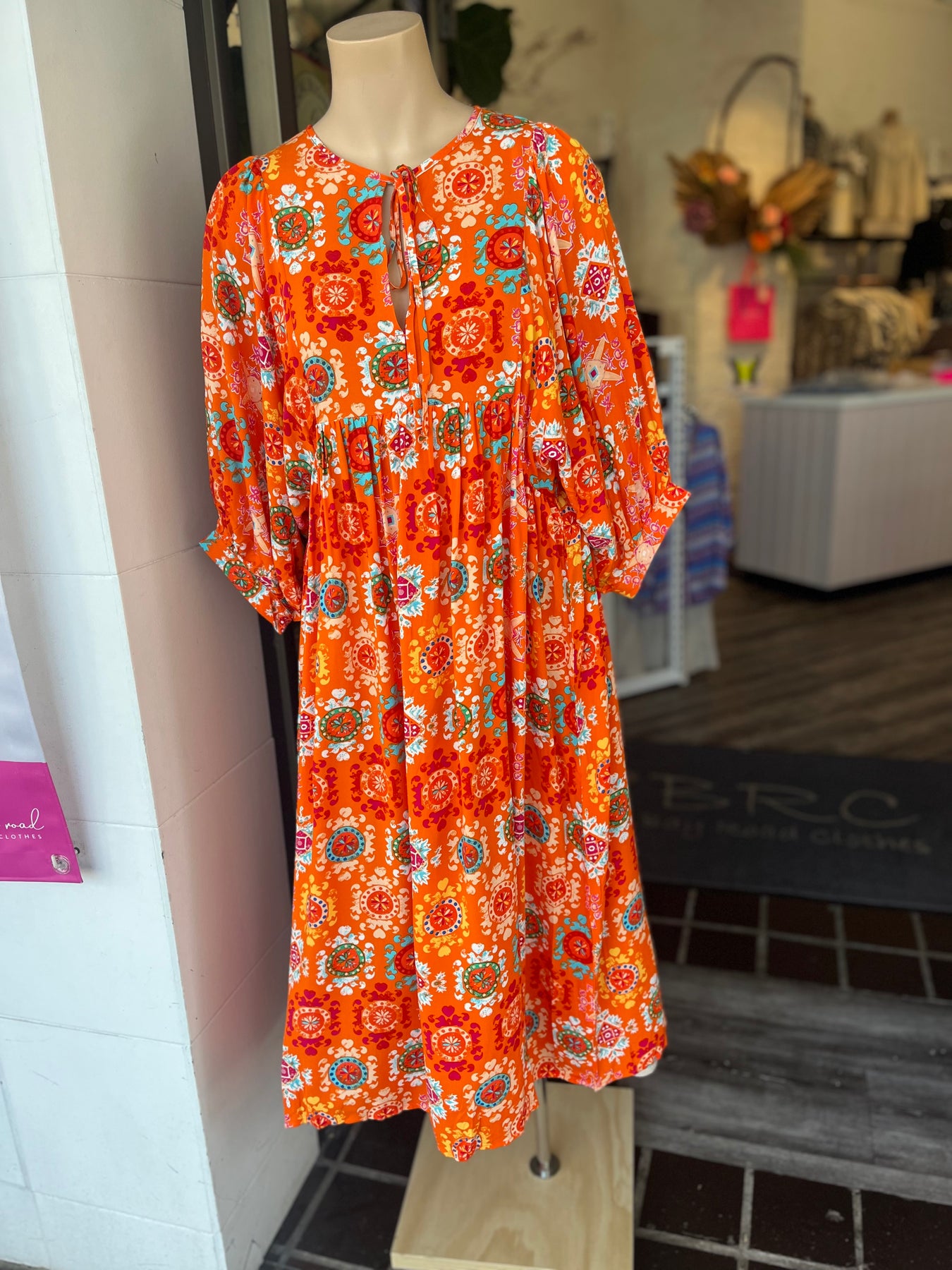 A breezy boho-inspired midi dress, crafted in lightweight printed rayon for effortless summer style. The relaxed silhouette, tie neckline, and flowing hem make it a versatile piece that moves easily from day to night.