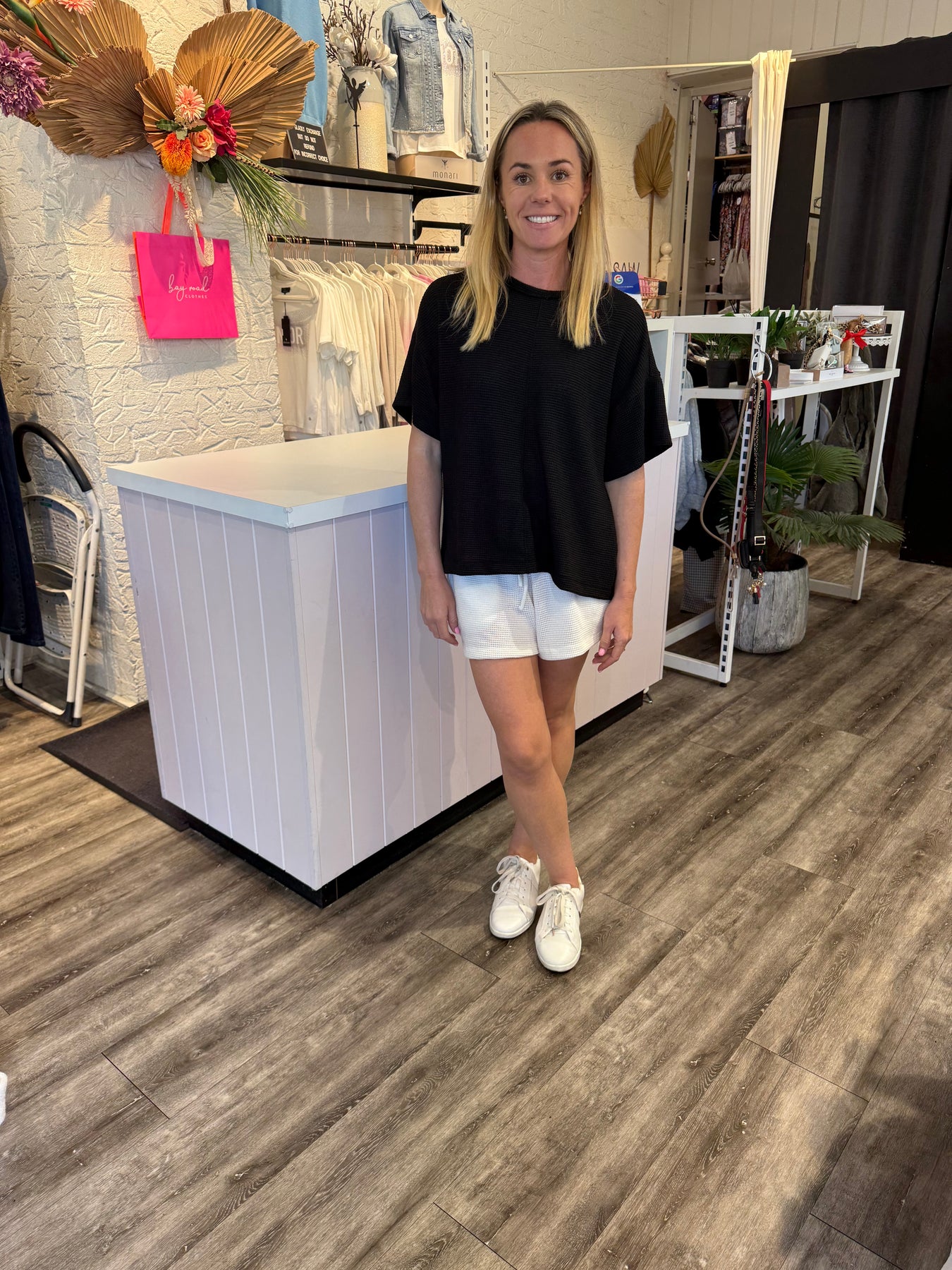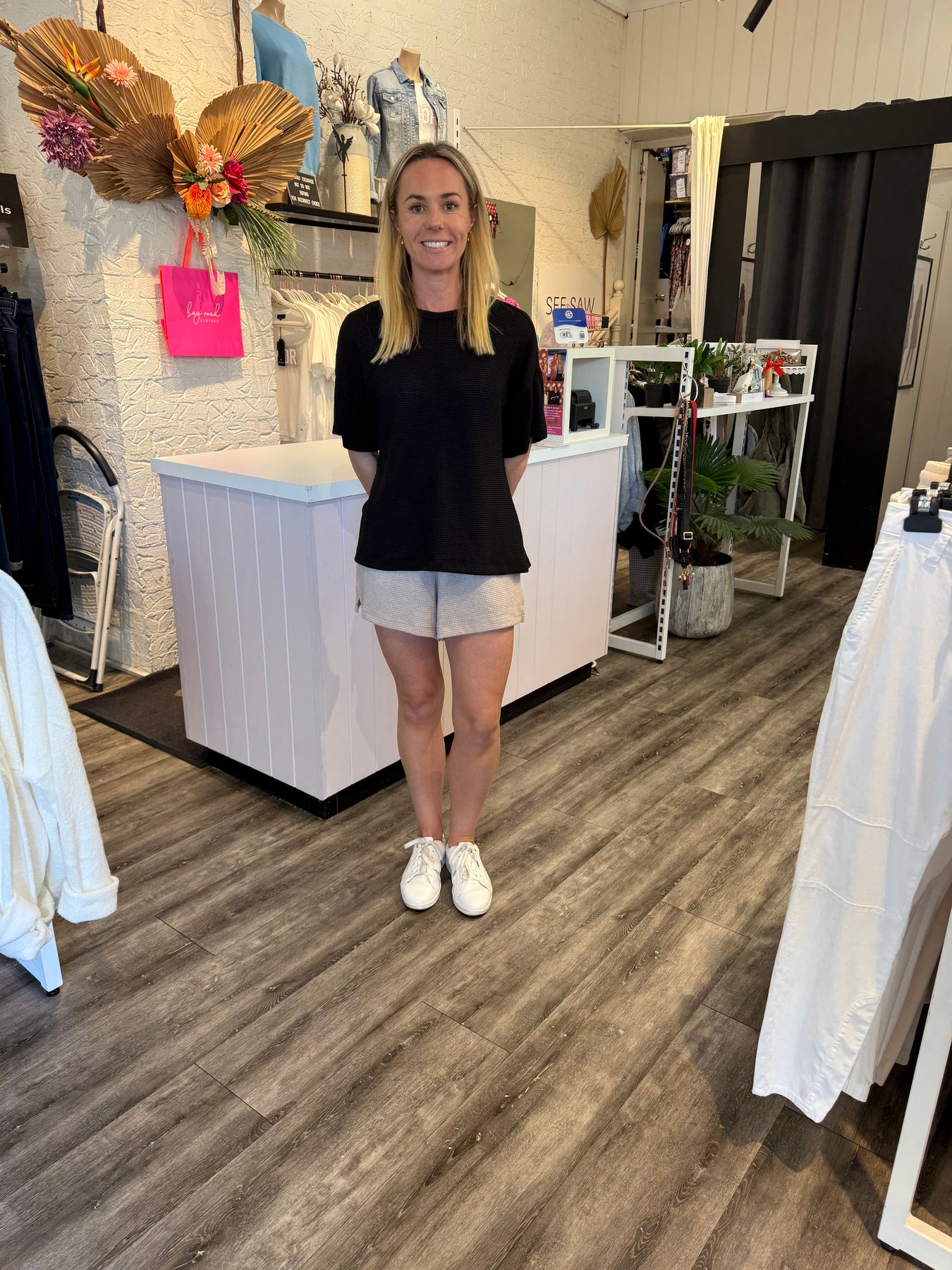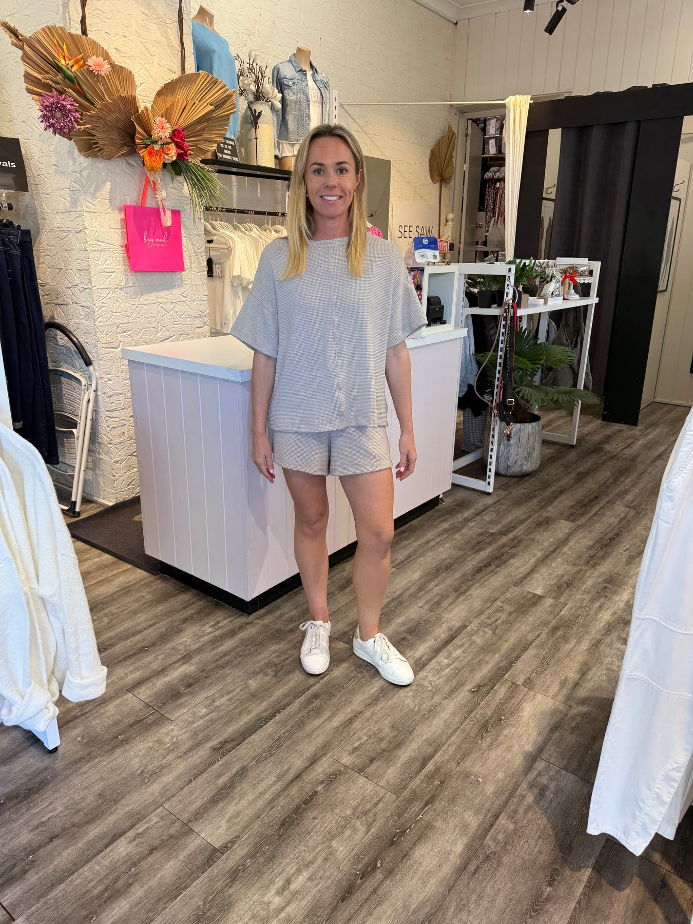 The top features a round neck, drop shoulder, short sleeve, with seams running down the front and back, giving this a great forgiving shape.