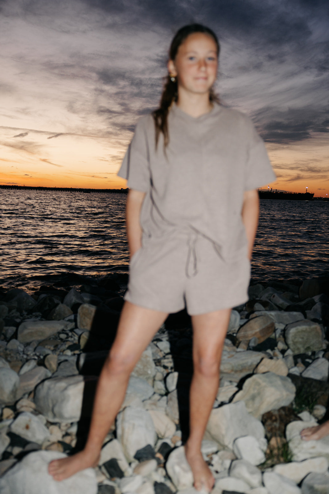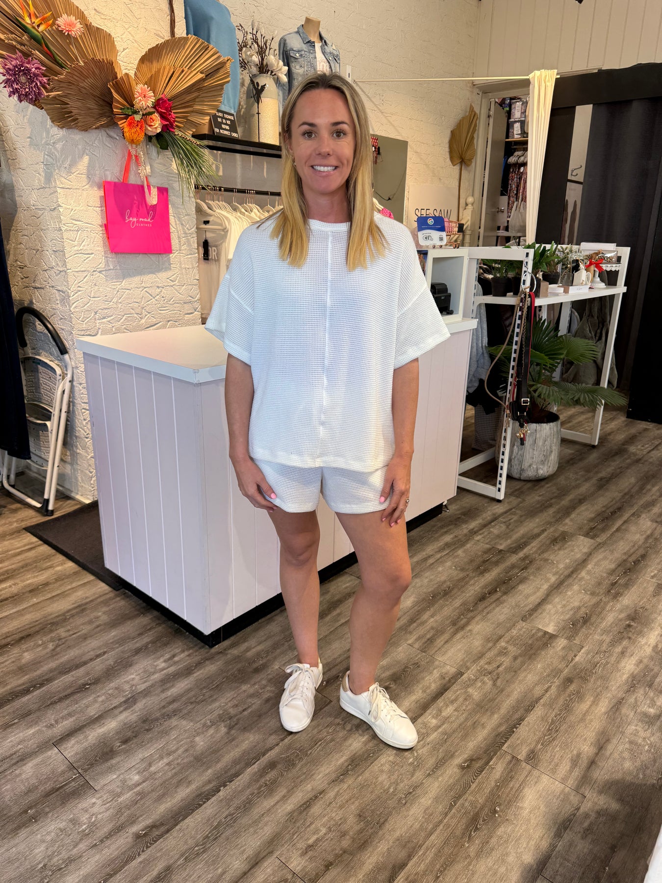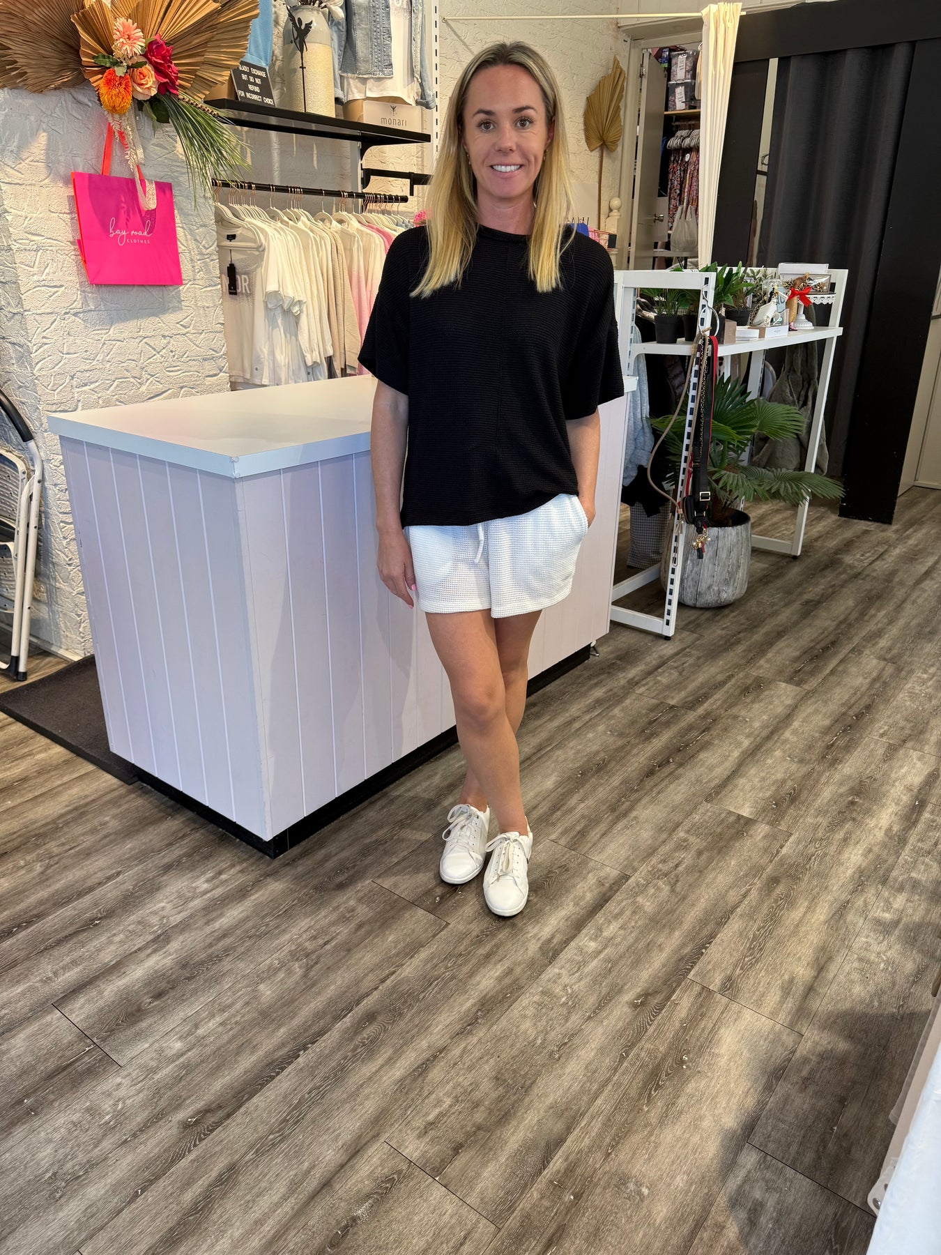 The top features a round neck, drop shoulder, short sleeve, with seams running down the front and back, giving this a great forgiving shape.