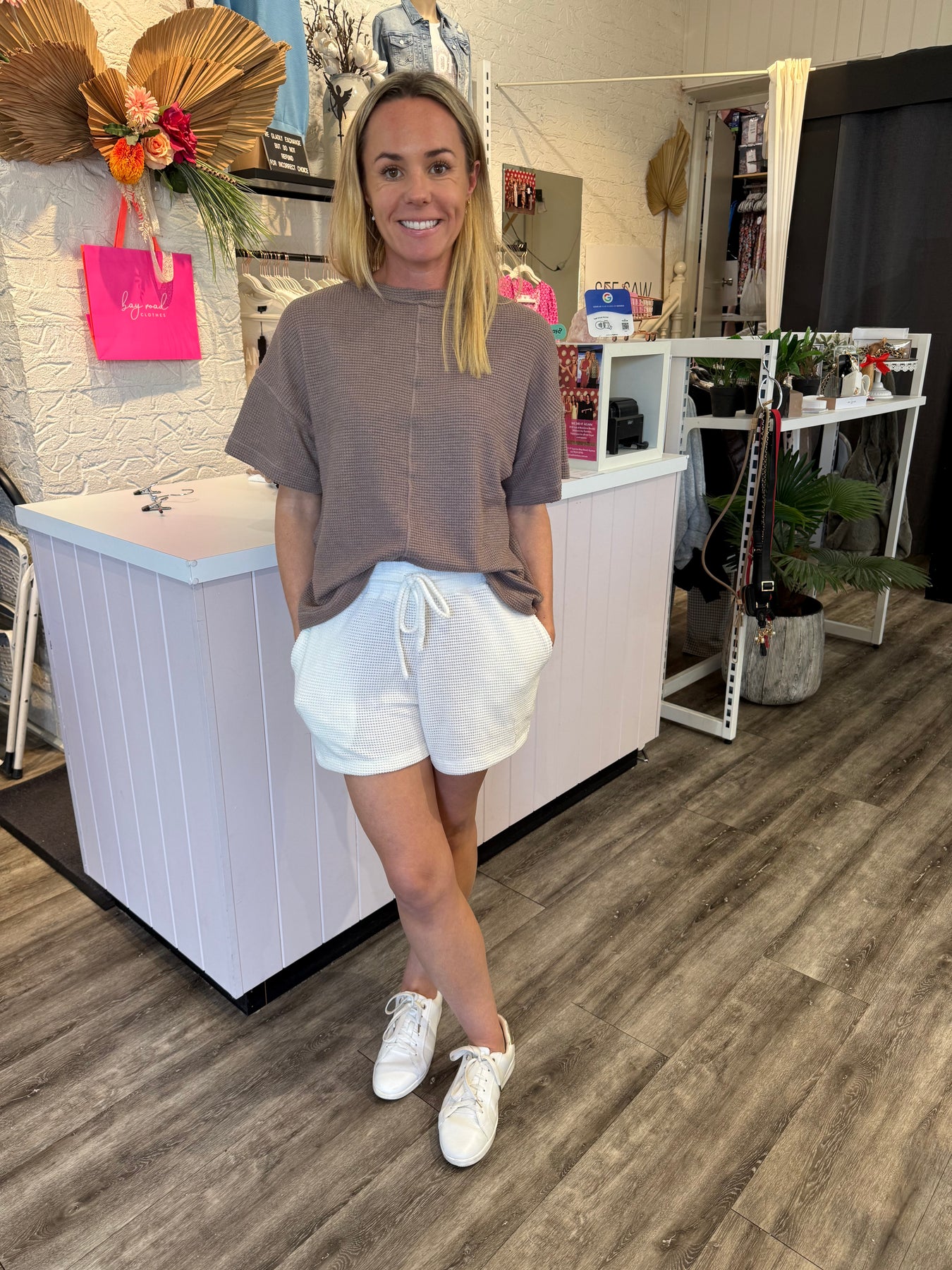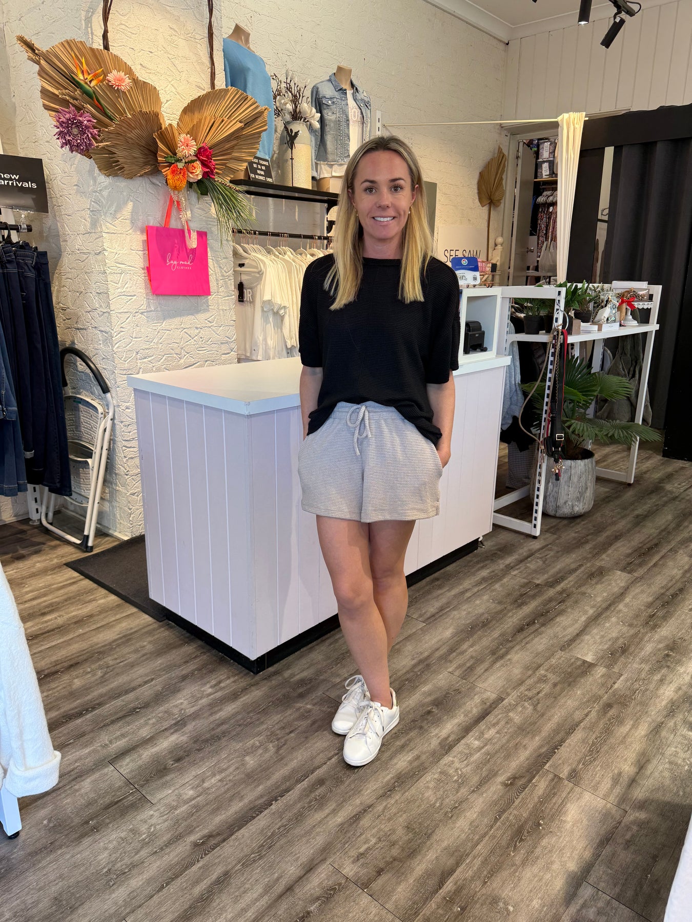 The shorts are elasticated waist featuring a drawstring and pockets. They are so spongy and comfortable to wear.